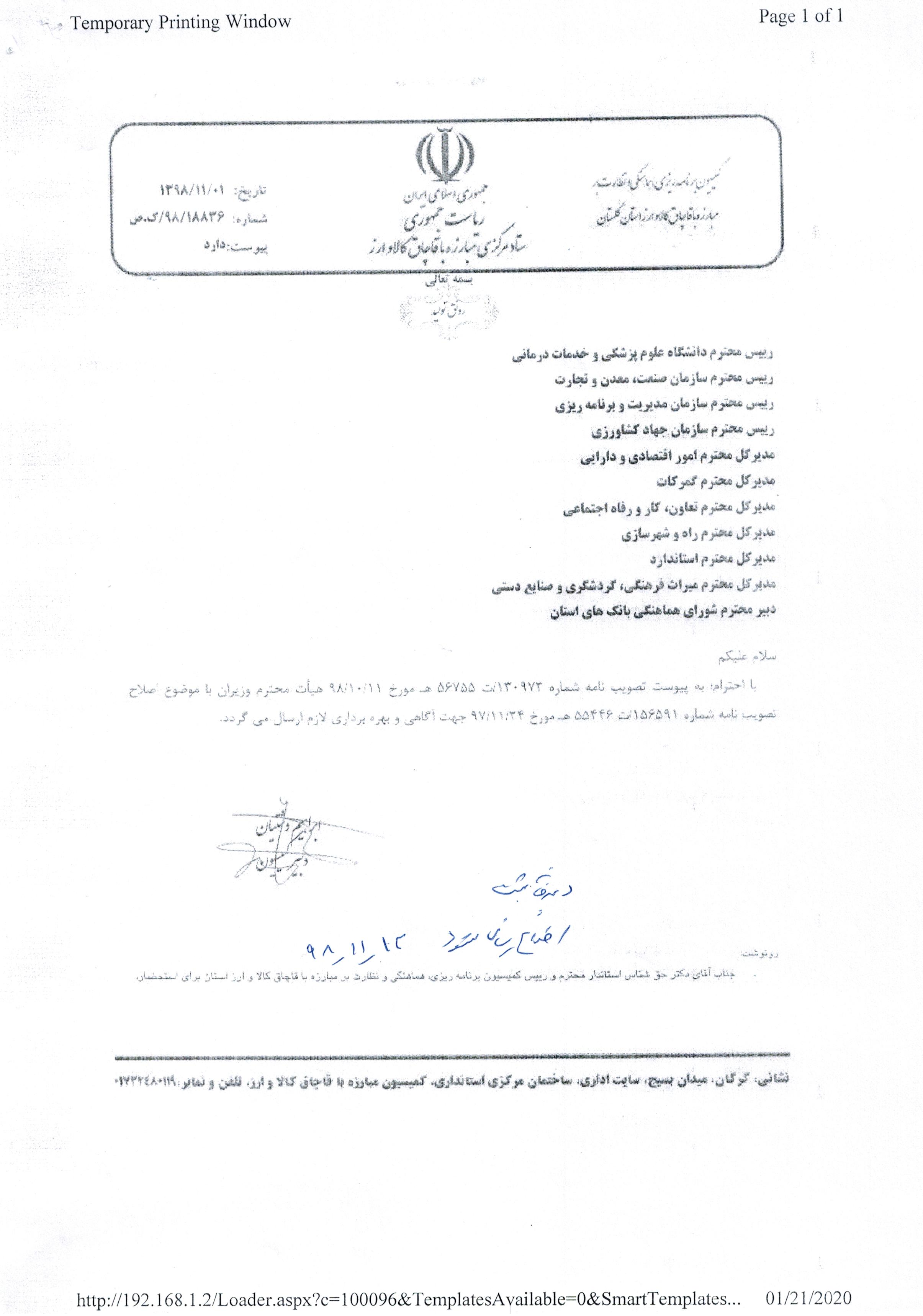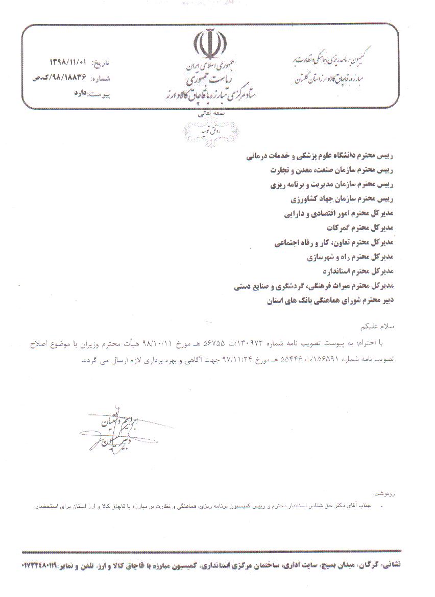 تصویب نامه هیئت نامه وزیران از آقای دشتیان کمیسیون مبارزه با قاچاق کالا و ارز استان.