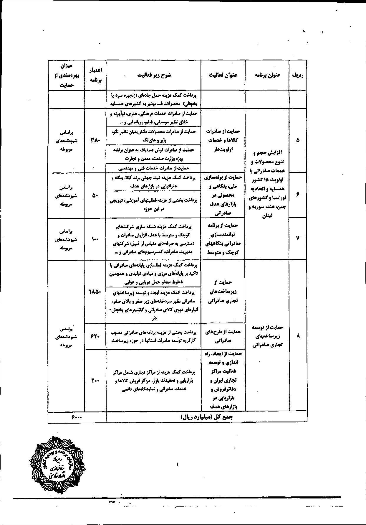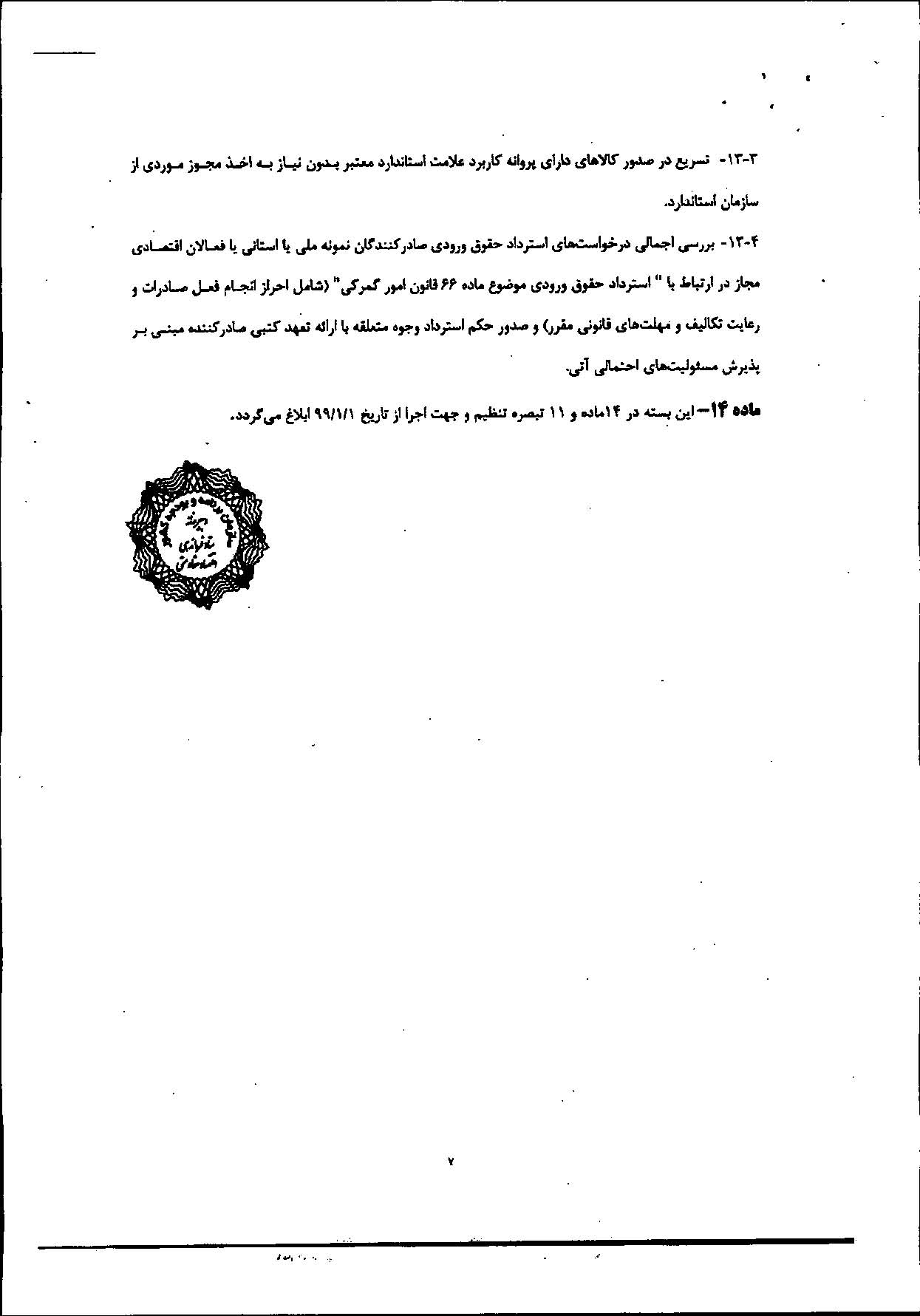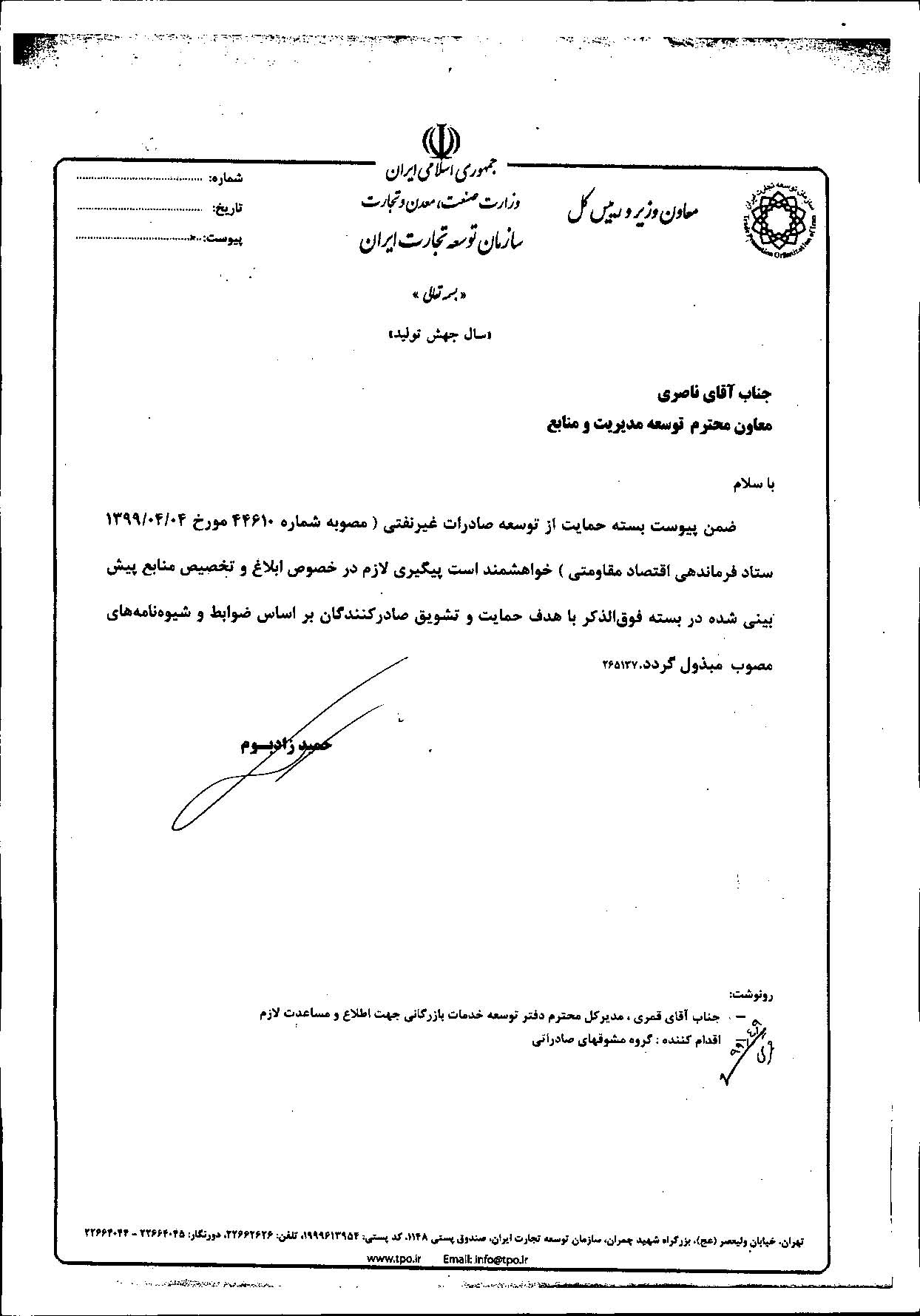 پرداخت مشوق‌های صادراتی مندرج در بند ۵ بسته حمایت از صادرات غیر نفتی سال ۱۳۹۹ که توسط معاون اول محترم رئیس جمهور و رئیس ستاد فرماندهی اقتصاد مقاومتی ابلاغ گردیده است