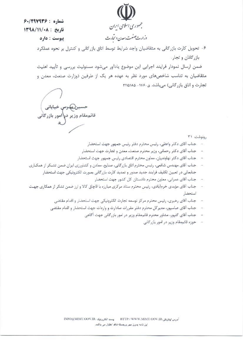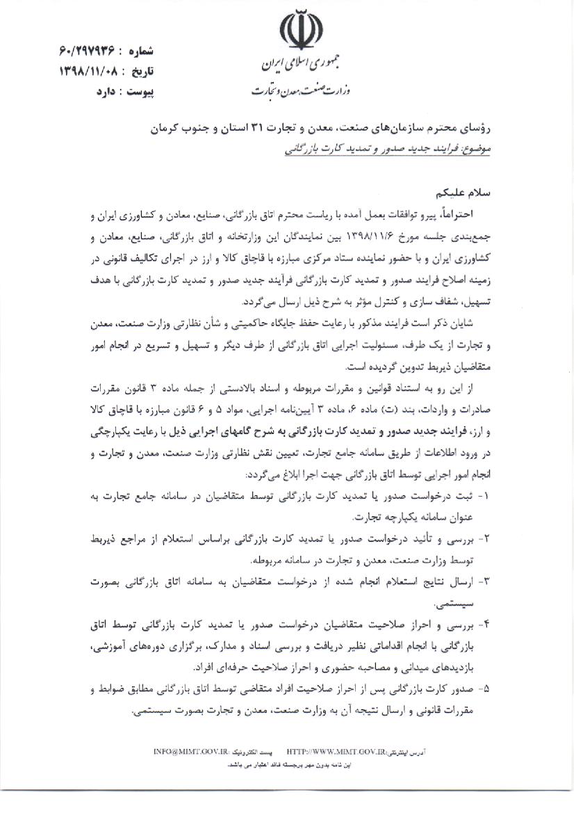 تایید کارت های بازرگانی سازمان صمت از طریق سامانه یکپارچه اعتبار سنجی و رتبه بندی اعتباری
